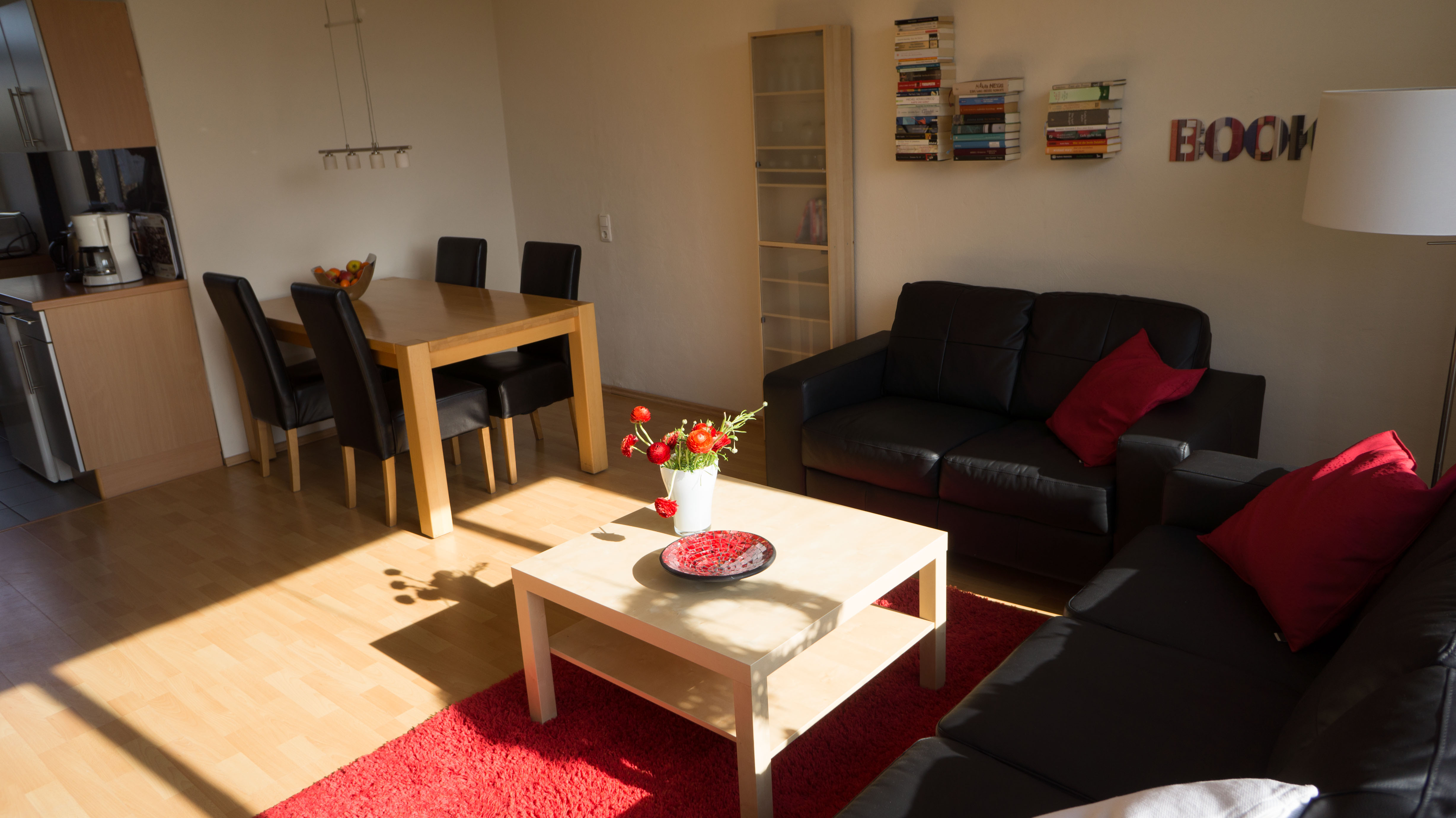 De woon/eetkamer is ingericht met een eettafel en vier stoelen en twee banken met een kleine tafel. Er is ook een tv-bank met een flatscreen-tv en een dvd-speler. U kunt alleen Duitse tv-zenders via SAT ontvangen. Vanuit de woonkamer kom je in de twee slaapkamers. Een slaapkamer is ingericht met een tweepersoonsbed (1.60 x 2.00), een kledingkast, nachtkastjes en een spiegel. De andere slaapkamer heeft twee boxspringbedden (elk 0,90 x 2,00) die afzonderlijk of samen kunnen worden gezet. Deze slaapkamer heeft ook een kledingkast met een spiegel en twee nachtkastjes.